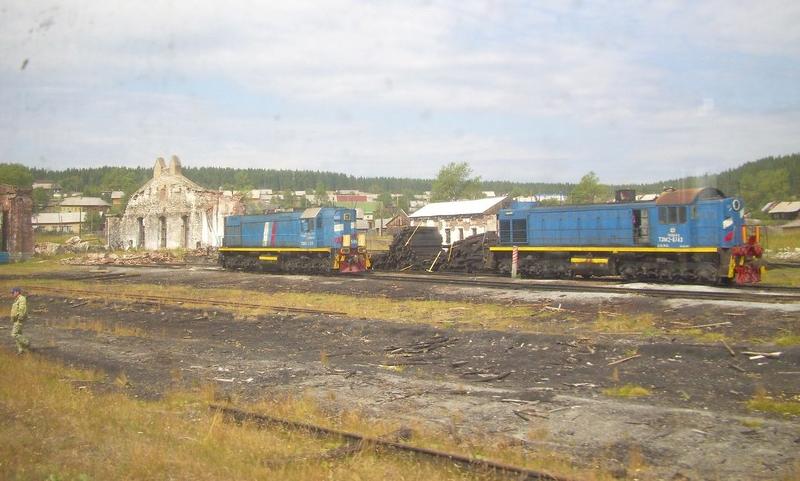 Развалины депо на станции Кын. Тепловозы ТЭМ2-586 (слева) и ТЭМ2-6743.