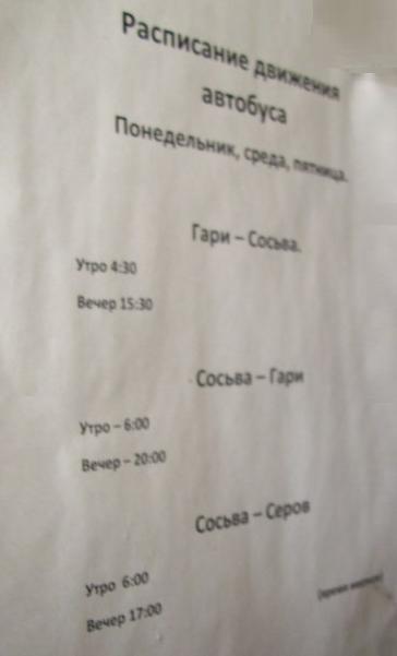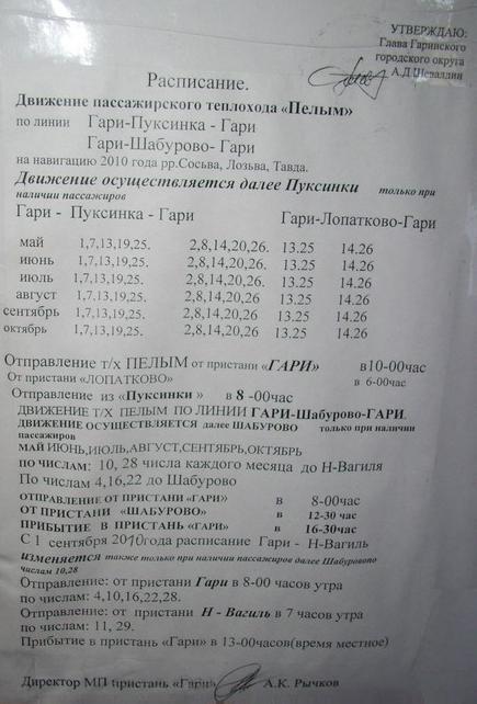 Расписание движения «Пелыма» (сфотографировано
