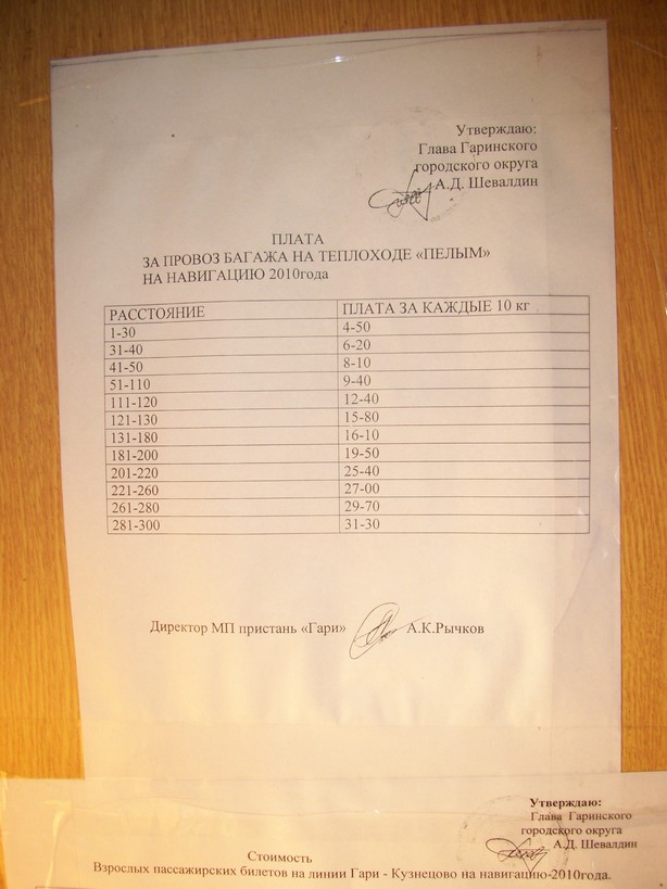 Плата за провоз багажа на «Пелыме» (сфотографировано на борту катера).