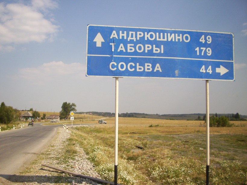Выезд из Гарей. Дорожный указатель на Сосьву и Таборы. В действительности дороги