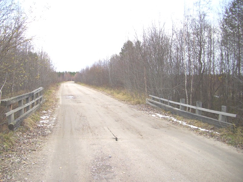 Выдвигаюсь пешком в сторону Мурманской автотрассы. Посёлок Идель связан с ней песчаной «грунтовкой» с деревянными мостами. Длина этой дороги 8 километров.