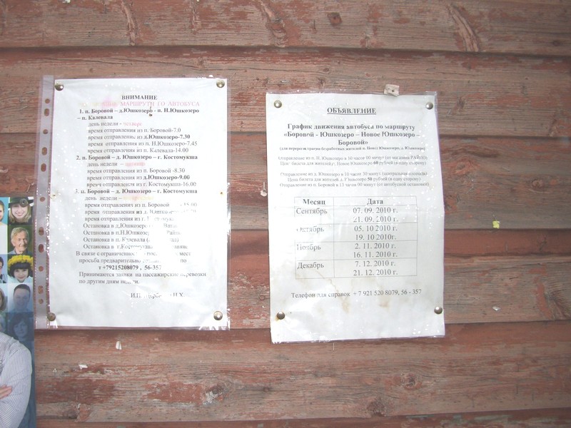 Юшкозеро. Объявления с информацией об автобусах. Эти автобусы периодически застревают в грязи. Время 15:53.