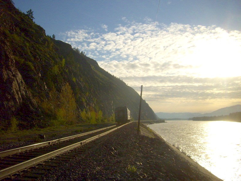 пролегает вдоль берега реки Абакан. Поезд уходит в сторону Аскиза. Время 7:34.