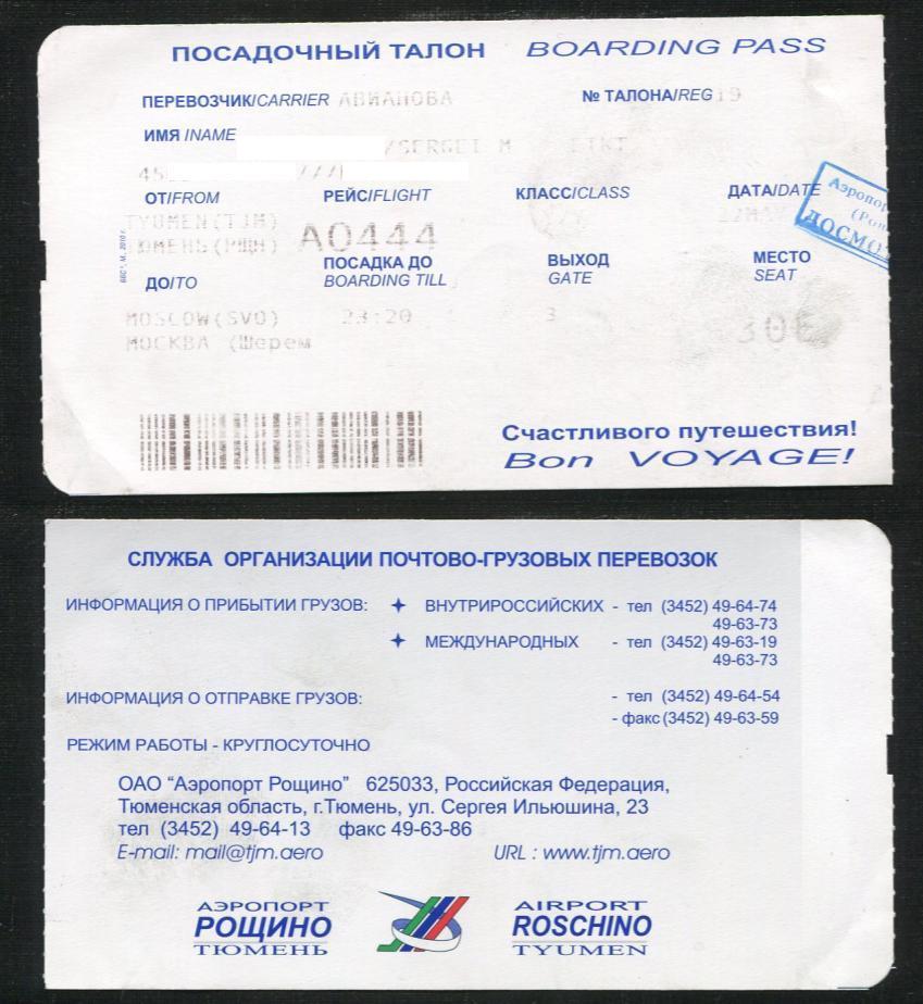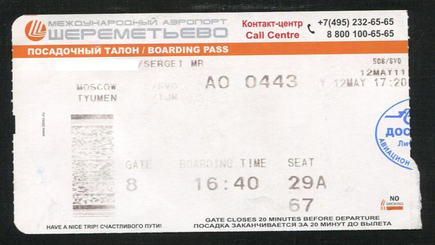 Посадочный талон на рейс Тюмень — Москва-Шереметьево.