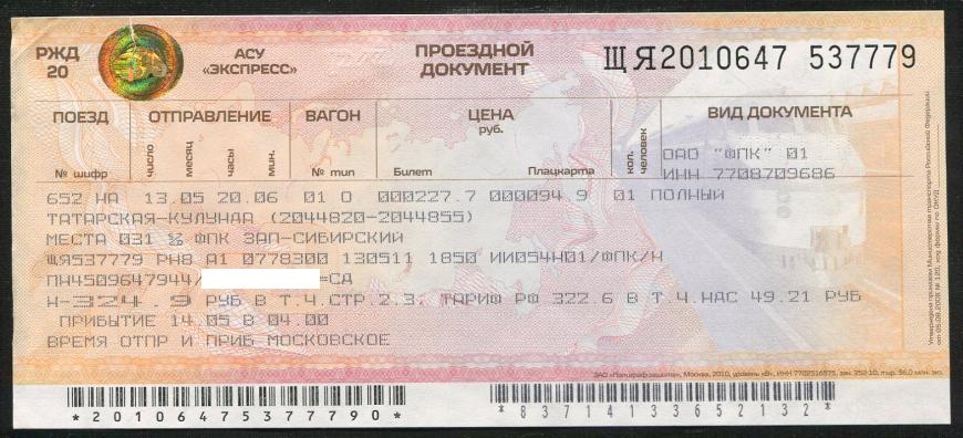 Билет от Новосибирска до Татарской в плацкартный вагон поезда Новосибирск — Брест.