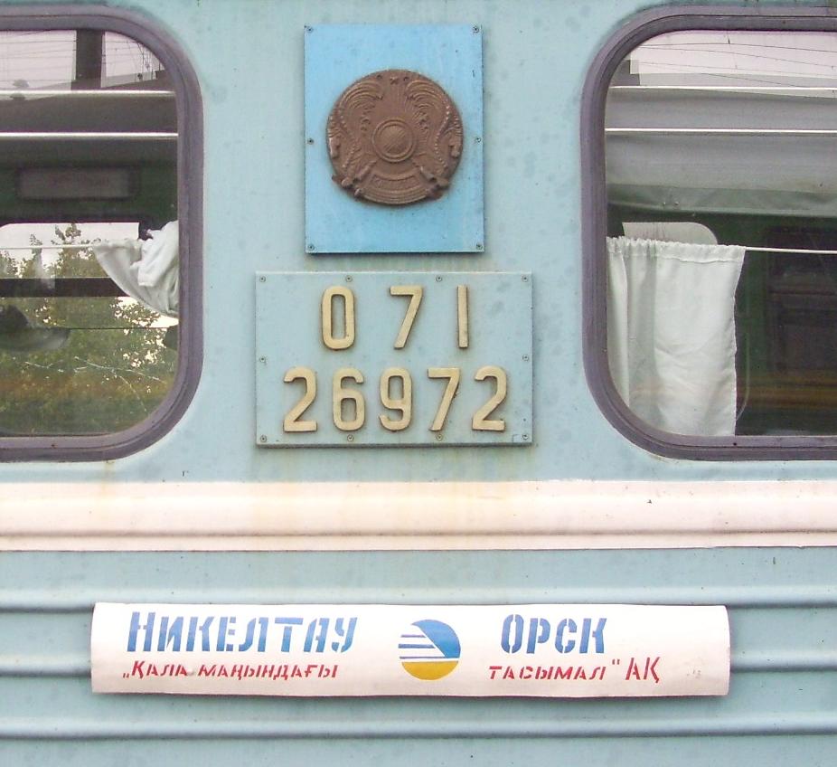 В расписании по Орску никаких поездов в Казахстан теперь не значится. Однако на втором пути, напротив вокзала, стоял одновагонный поезд характерной для Казахстанской железной дороги расцветки. Подхожу ближе — так и есть, поезд казахстанский! На вагоне присутствует маршрутная доска: «Никелтау — Орск».