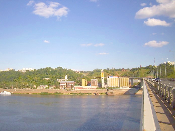 Вид с метромоста на правый берег. Вдали — элеватор. Справа от него,