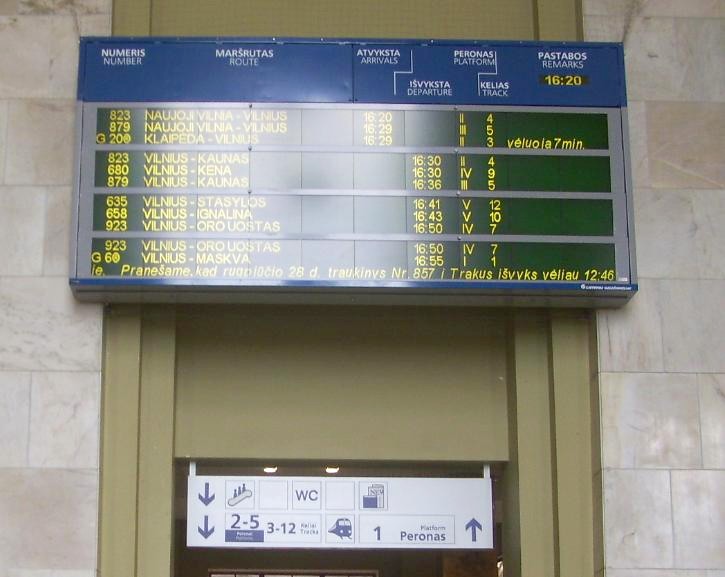 Вокзал на станции Вильнюс. Табло с отображением ближайших отправляющихся поездов.