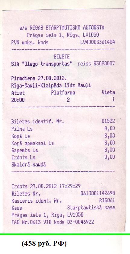 Приобретаю билет с отправлением в 20:00. Цена — 8 лат (458 рублей), при расстоянии всего лишь 140 километров.