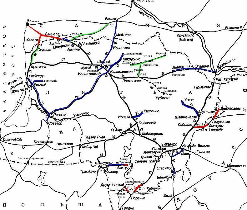 Схема железных дорог Литвы, по состоянию на 2012 год. Красным цветом выделены разобранные