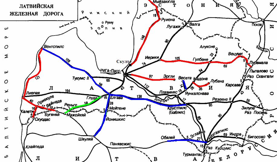 Схема железных дорог Латвии, по состоянию на 2012 год. Красным цветом выделены разобранные