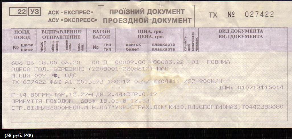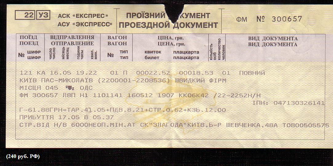 За 12 минут до отправления поезда берётся плацкартный билет Киев — Николаев за 62 гривны (240 рублей). С марта 2012 года гривна резко подорожала к рублю, соответственно и билеты подорожали. Но в РФ билет на 587 км (расстояние от Киева до Николаева через Фастов, Долинскую) стоил бы около 1000 рублей.