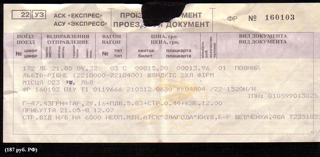 Билет Львов — Ровно. Расстояние — 207 км, для Украины — чрезвычайно дорого.