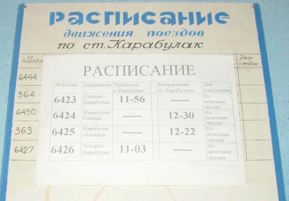 Поезда Сенная — Карабулак — Аткарск и Аткарск — Карабулак — Сенная в ходу по нечётным числам. Это единственные пассажирские поезда на линии Аткарск — Сенная. Причём и все железнодорожники на участке Сенная — Петровск (исключая станцию Петровск) выходят на работу только по нечётным числам. Длина линии немаленькая — 199 километров.