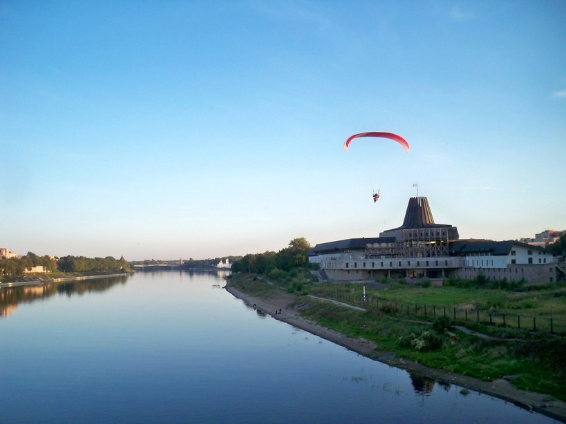 В сумерках иду назад, в центр города. Над рекой Великой активно летали мотопарапланеристы. Они тоже совершали виражи на грани хулиганства. Почему любой желающий не может иметь это простое устройство для полёта, которое на вид должно быть не дороже обычного мотоцикла?