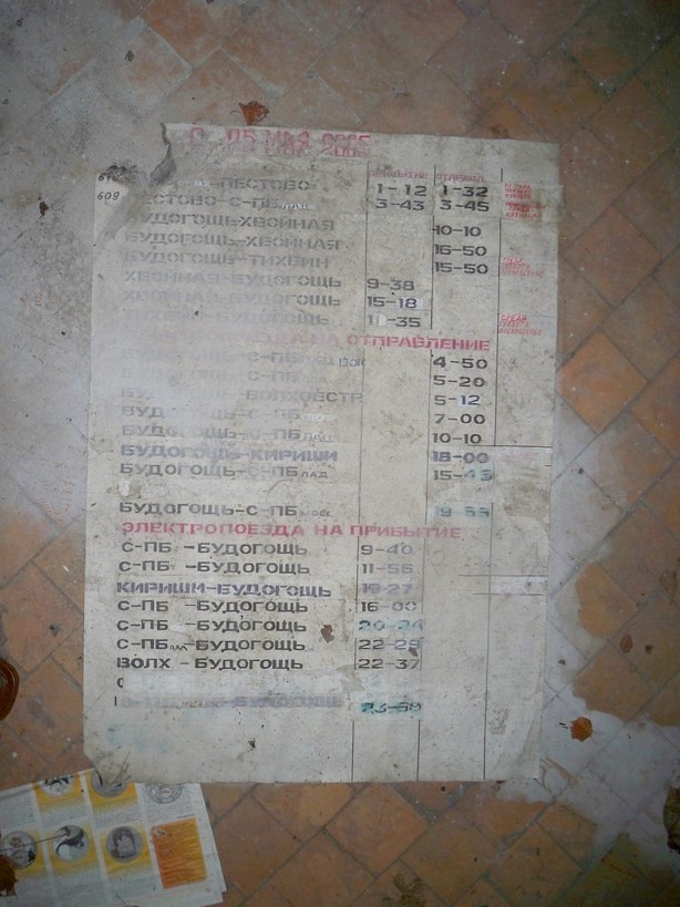 Ближайшим утром отправляется поезд сообщением Тихвин — Будогощь. Железнодорожная линия Тихвин — Будогощь является одной из самых малодеятельных в России. На ней нет никакого движения, кроме одной пары пригородных поездов один раз в неделю, по субботам, и редких путейских дрезин.