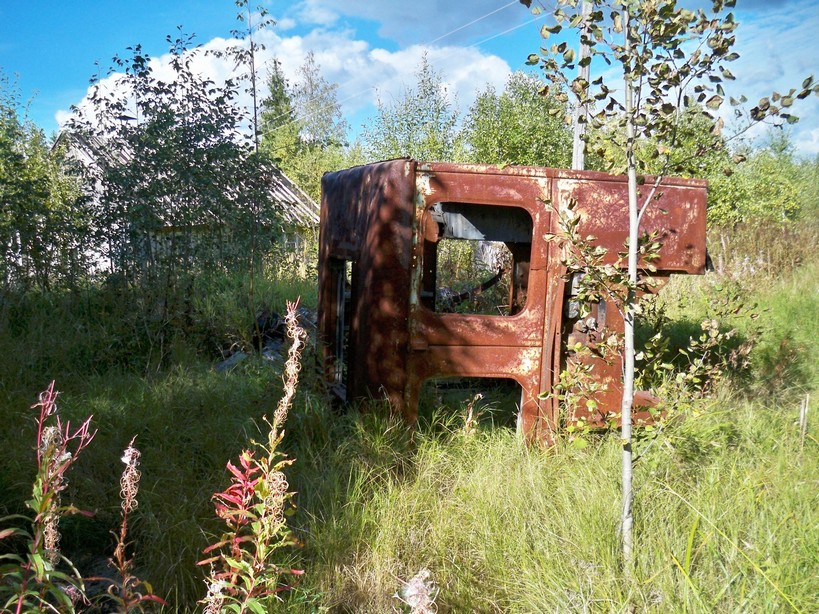 В отличие от Водогона, здесь удалось найти одну кабину тепловоза и один крытый грузовой вагон. Расспрашиваю об узкоколейной железной дороге жителя одного из самых дальних домов. По его словам, дорога разобрана в 1990-х годах.