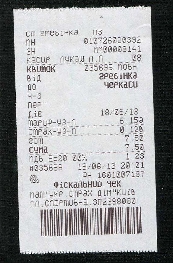 Билет Гребёнка — Черкассы.