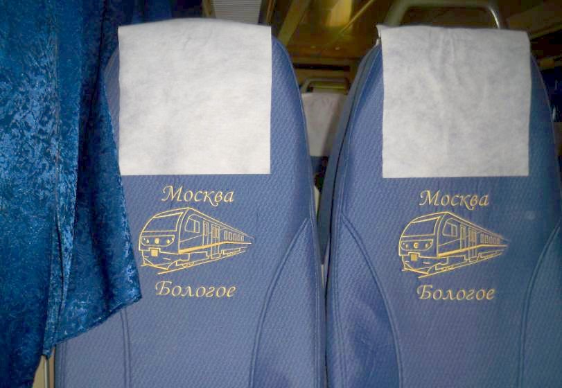 Электропоезд ЭР2Т-7232. Оформление сидений, оставшееся от прежнего маршрута.