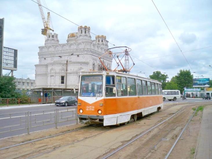 Трамвайный вагон маршрута №6 у воссоздаваемого храма Александра Невского на Привокзальной площади.