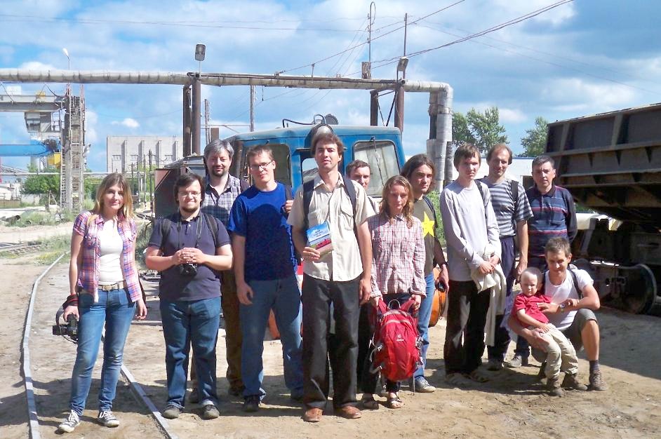 Участники поездки на заводе. Среди участников экскурсионной поездки: Георгий Красников (выдающийся путешественник, автор блога http://griphon-275.livejournal.com), Наталья Ерёмина, Денис Кабанов, Александр Малянов (исследователь узкоколейных железных дорог), Евгений Баскаков, Андрей Оболенский, Борис Панов, Антон Часов, Евгений Плыгунов, Наталья Дмитрак.