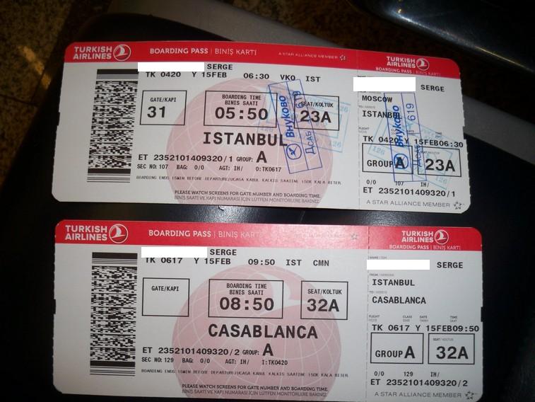 Был взят билет Москва — Стамбул — Касабланка — Стамбул — Москва на сайте турецкой авиакомпании Turkish Airlines http://www.turkishairlines.com. Даты — в феврале 2013 года, цена 12 554 рубля.