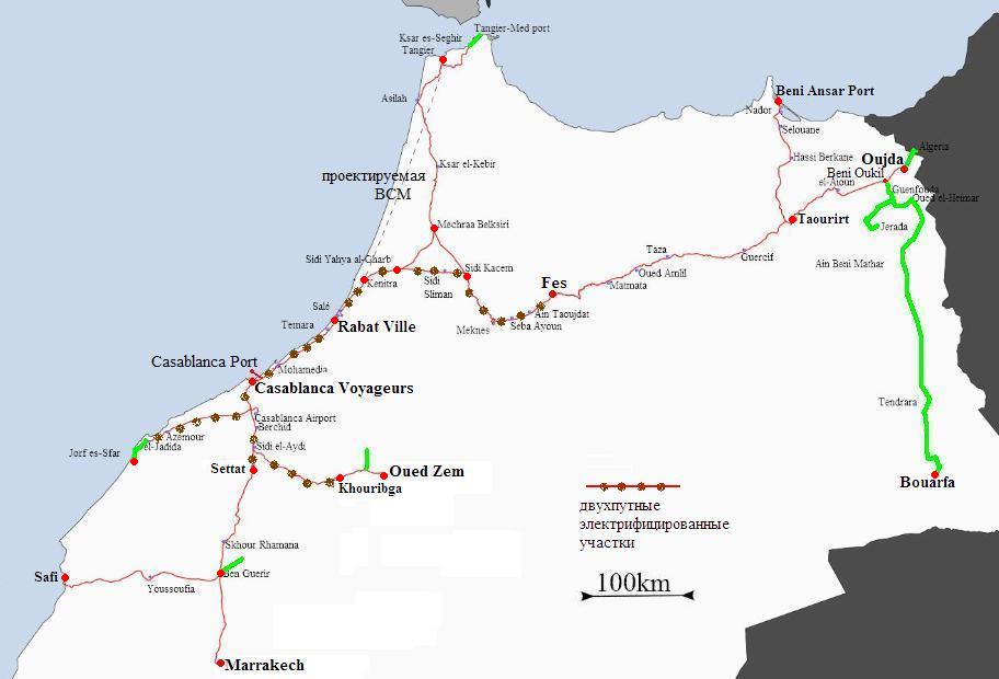 Всё, что находится восточнее Феса — не электрифицировано. Фес — единственная станция, на которой у пассажирских поездов в пути следования меняется локомотив.