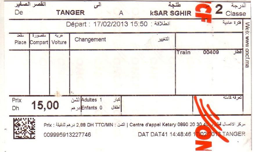 Билет от станции Tanger Ville (Танжер-Город) до станции Ksar Sghir, по новой линии,