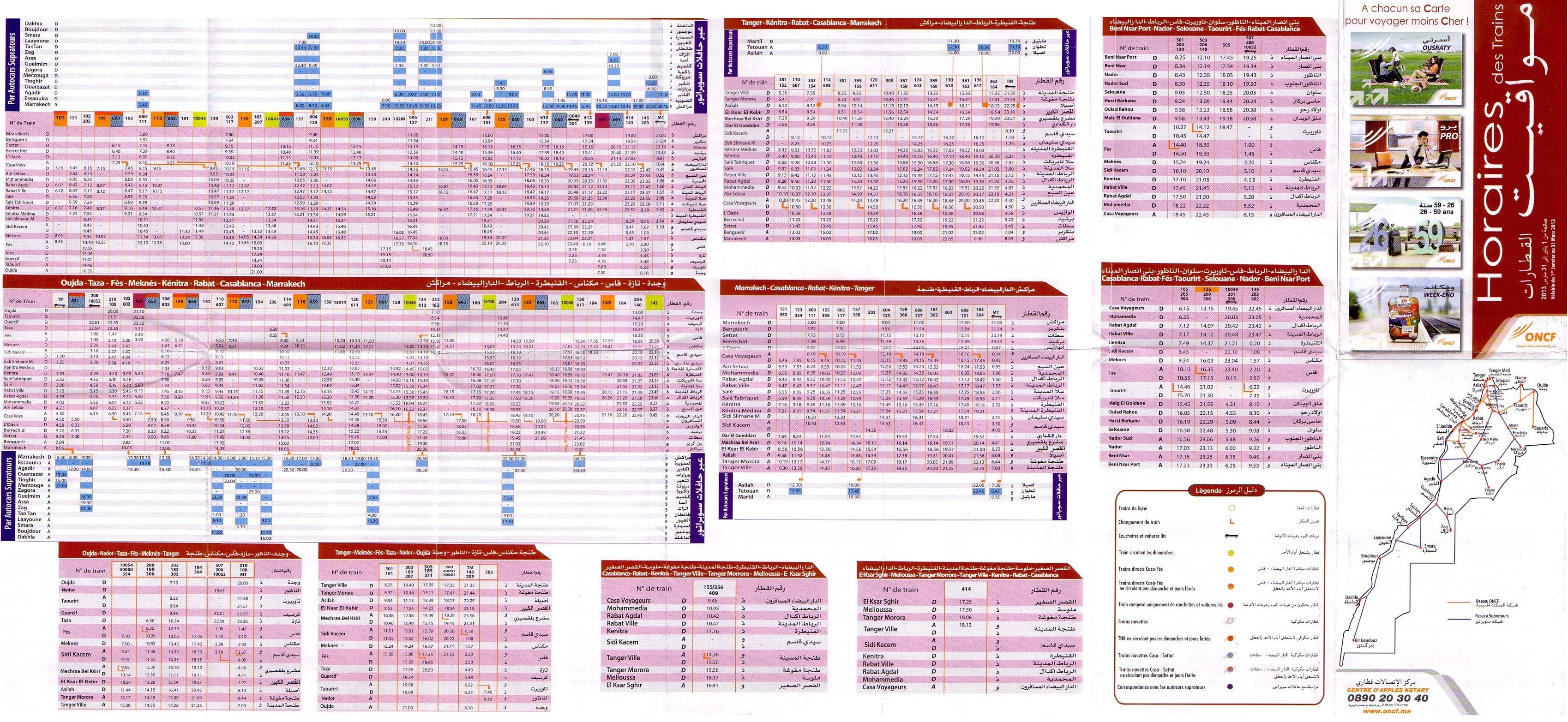 Минимальный объём пассажирского движения на Железной дороге Марокко — 1 пара ежедневных поездов (от Танжера на Ксар Сгир и на участке Хурибга — Уэд Зэм).