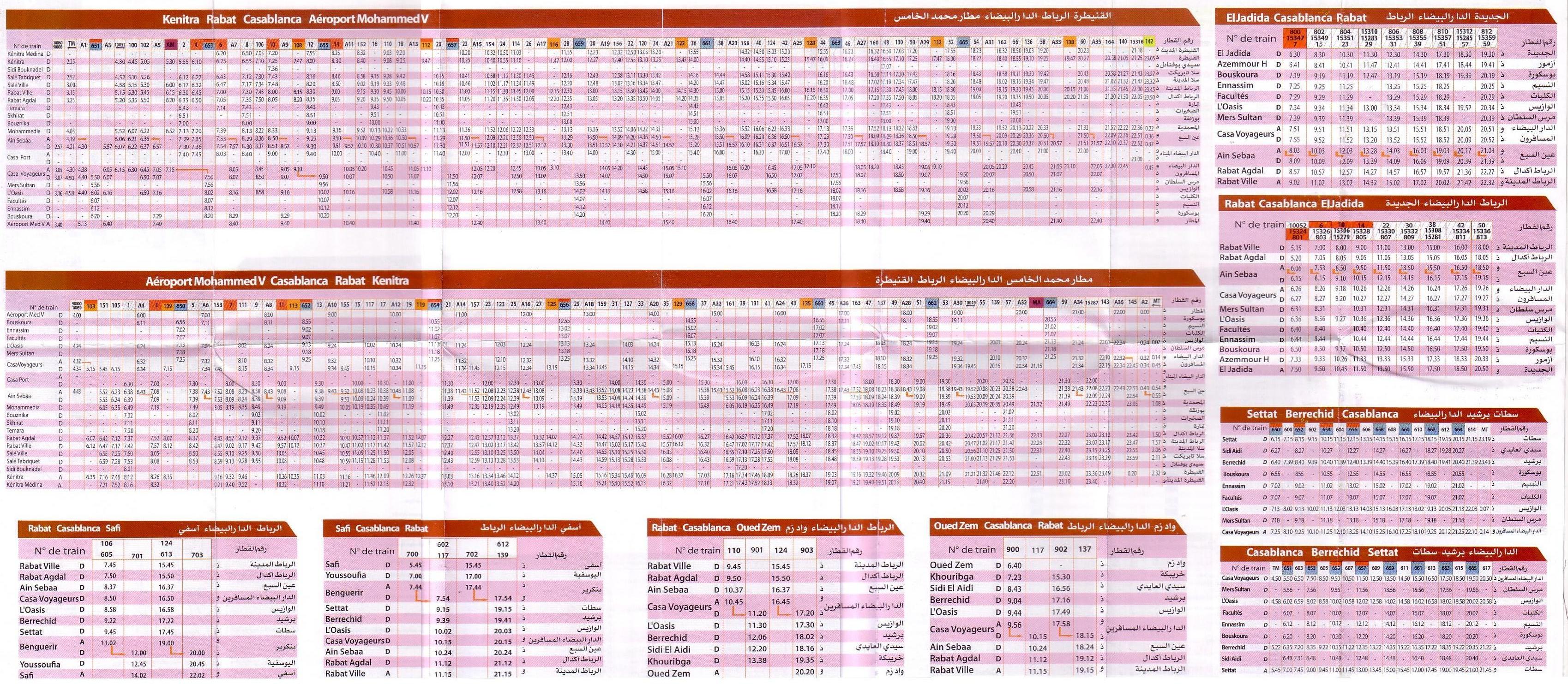 Пригородное сообщение (выделяю его по признаку использования моторвагонного подвижного состава) существует на участке главной магистрали Сеттат — Касабланка — Рабат — Кенитра с ответвлениями Бускура — Эль Джадида, Бускура — Аэропорт и Ain Sebaa — Casa Port (очень короткое). Все эти маршруты обслуживаются электропоездами двух основных типов, один из которых — двухэтажный.