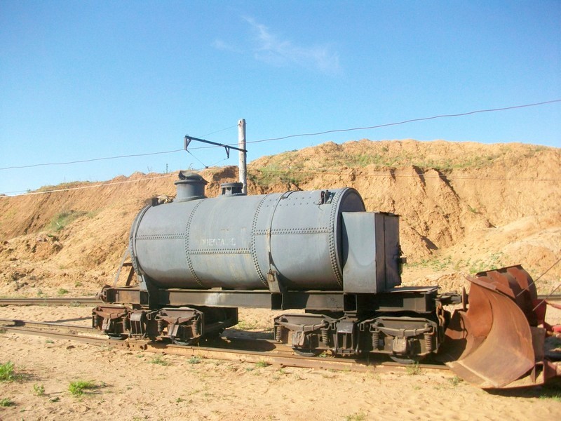 Коноховский карьер. Цистерна с клёпаным котлом и электровоз К14, превращённый в снегоочиститель.