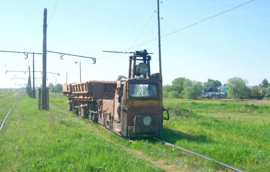 Двухпутный участок узкоколейной железной дороги. Электровоз ведёт поезд на карьер.