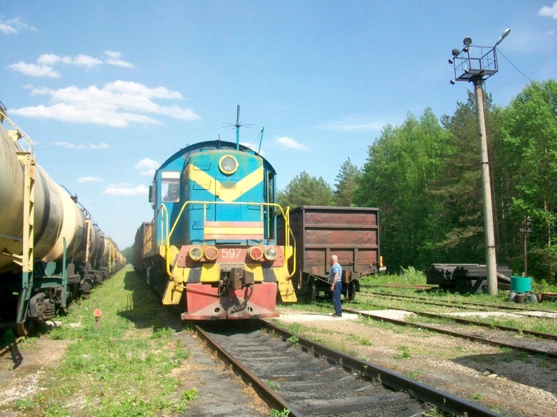 Станция Стрелка. Тепловоз ТЭМ2-597 привёл грузовой поезд со станции 3-й километр.