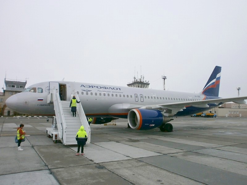 Самолёт Airbus A320-214, бортовой номер VP-BDK, собственное имя — «Георгий Свиридов». Заполненность стопроцентная — как мне показалось, ни одного свободного места.