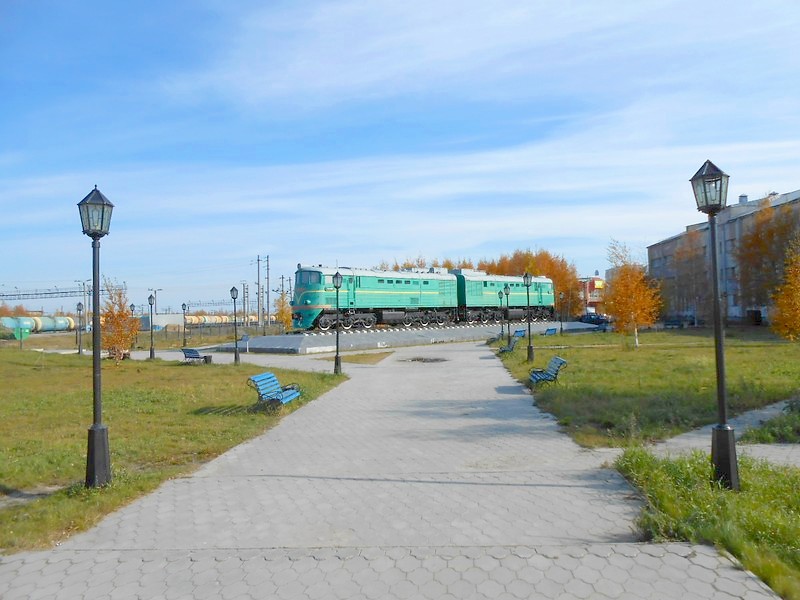Евгений почти сразу вышел ко мне. Встречаемся у тепловоза-памятника. Рядом, в непримечательном двухэтажном здании, находится управление Ямальской железнодорожной компании.
