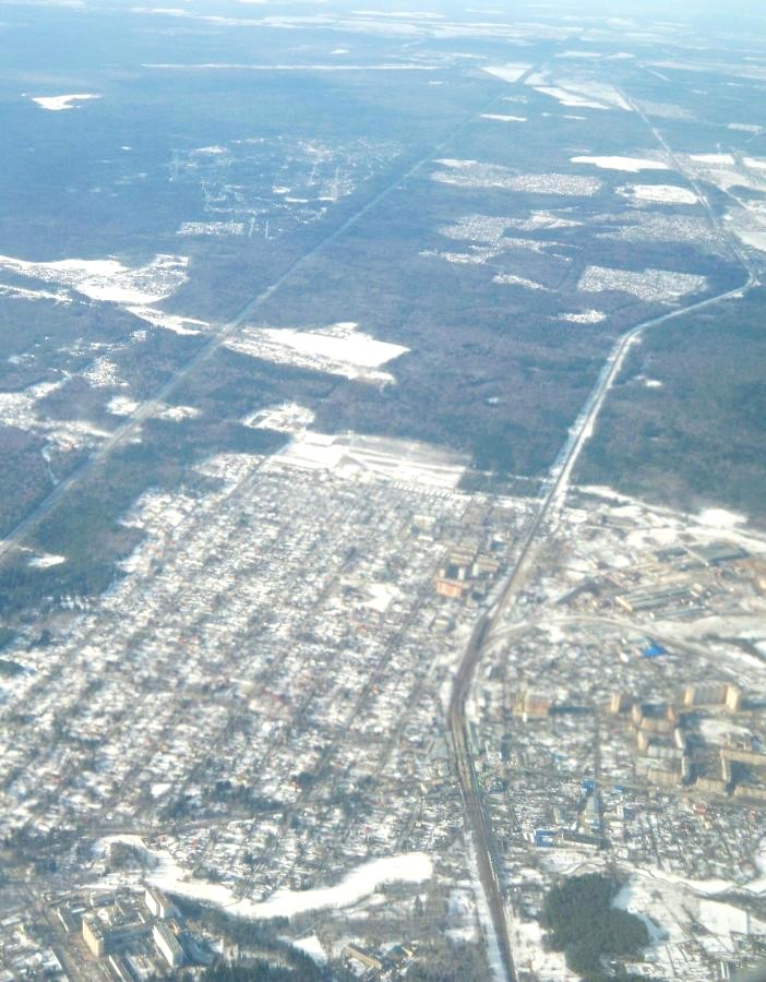 Сплошное скопление малоэтажной застройки, появляются широкие автодороги с активным движением, двухпутная железнодорожная линия.
