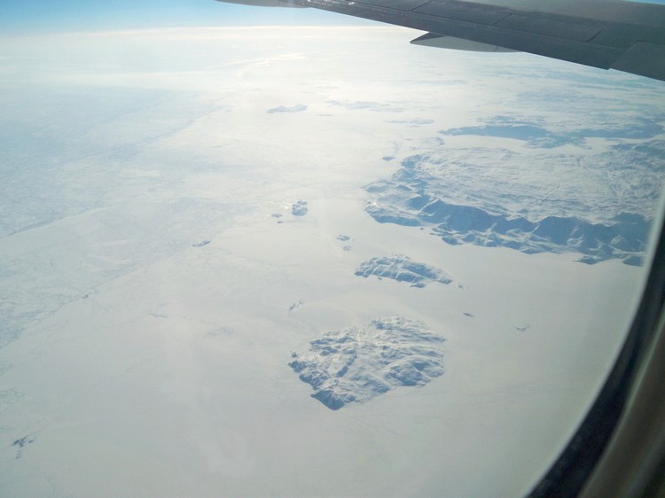 Незадолго до начала водных просторов — снова сплошная облачность. Лишь немного, в короткие едва заметные «просветы», удалось увидеть Исландию. Этот остров относят к Европе. Потом незаметно пересекается остров Гренландия, который относят к Америке. Хотя принадлежит он пока ещё Дании, постоянно ведя разговоры о стремлении к независимости.