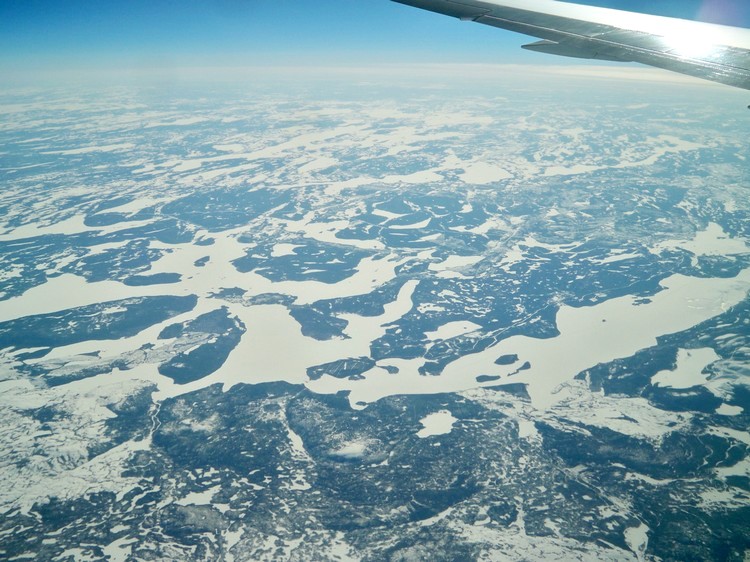 Больше двух часов полёта над заснеженными просторами Канады. Вначале местность похожа на Антарктиду. Никаких следов жизни нет.