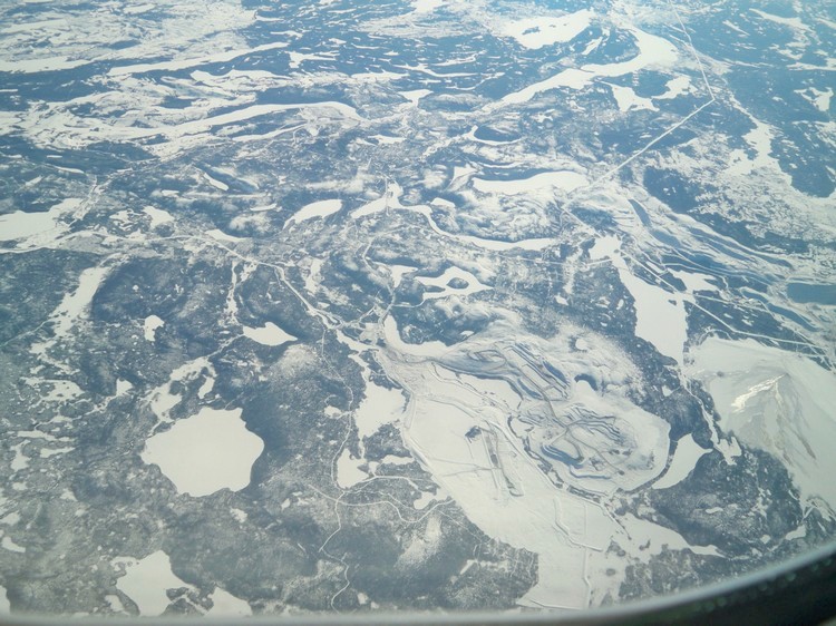 Первый узнаваемый объект — огромные железорудные карьеры Шеффервиль. Хорошо видны гигантские «ямы», отвалы, отстойник (хвостохранилище). Эти карьеры — крайний северный пункт изолированной канадской железной дороги Sept Iles — Schefferville. Возможно, через несколько лет я получу канадскую визу и попаду в эту загадочную точку. Судя по всему, там не был ещё ни один любитель железных дорог!