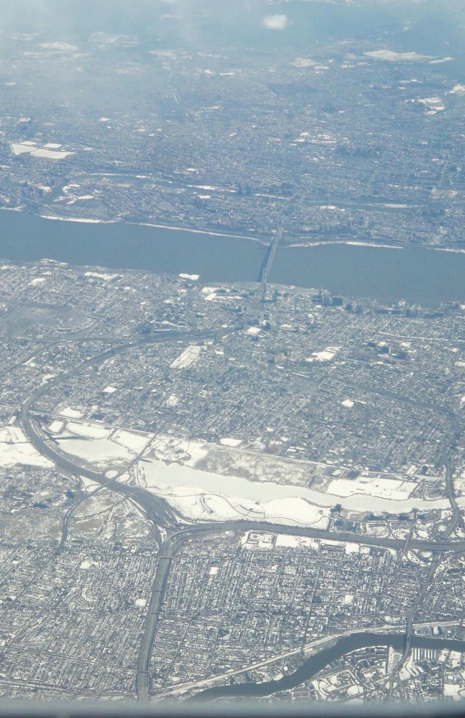 Широкая река Гудзон. Среди снегов она хорошо заметна: вода не замёрзла. Самолёт снижается, следуя вдоль правого берега реки. Я пытаюсь опознавать населённые пункты.