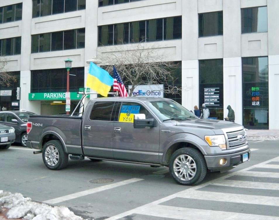 На одном из перекрёстков Вашингтона встретился автомобиль, к которому были прикреплены флаги США и Украины.