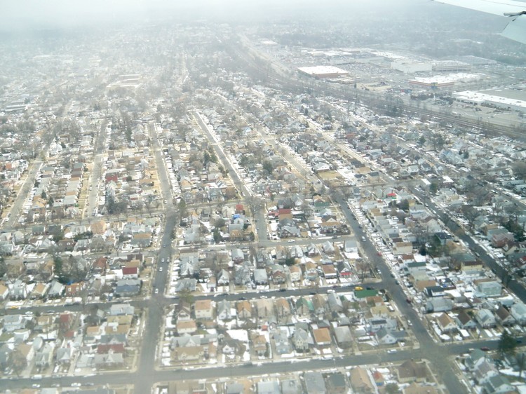 Самолёт развернулся над водными просторами. В этот момент была облачность. Земля снова показалась над малоэтажными районами Лонг-Айленда. Это восточная часть Нью-Йорка и его пригороды.