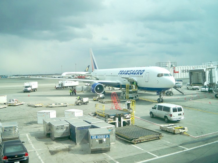 Аэропорт Нью-Йорк JFK. Прибывший из Москвы самолёт B767-300 с бортовым номером EI-DBU.