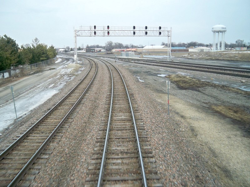 Станция Galesburg (Гейлсберг) остаётся позади. Вид на восток, в сторону Чикаго.