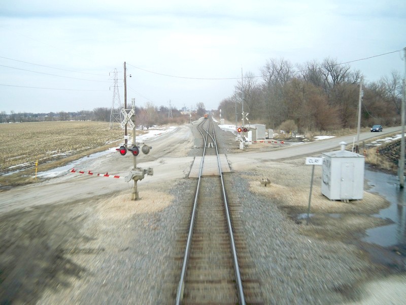 Поезд пересекает двухпутную линию. Вид на восток, в сторону Чикаго. Время 18:03.