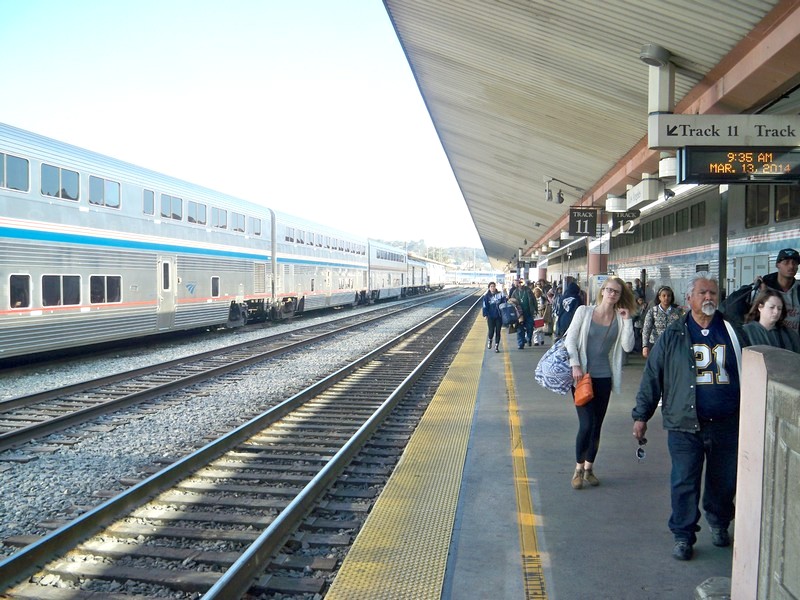 Производится посадка пассажиров в поезд №14 «Coast Starlight» сообщением Лос-Анджелес — Сиэтл.