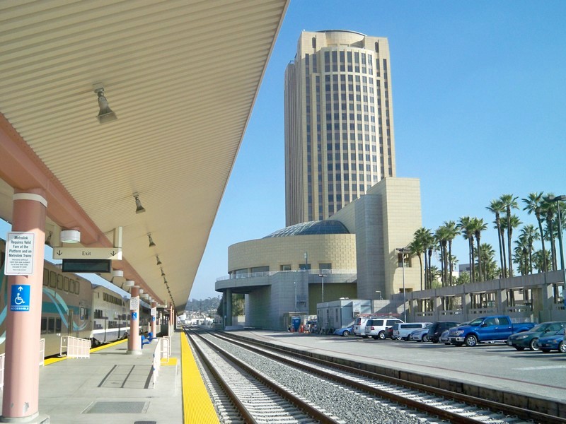 этой станции заканчивается движение пригородных поездов от Лос-Анджелеса. Время 11:44.