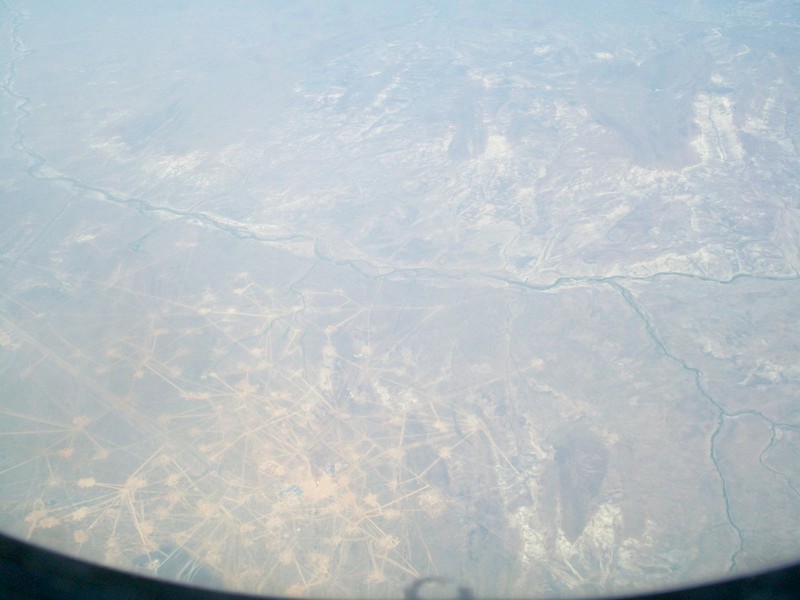 Взлёт в 18:31. Первые два часа внизу бескрайние степи Казахстана, иногда сменяющиеся невысокими горными массивами. Заметные следы жизни в виде распаханных полей появляются почти одновременно с географической границей Европы и Азии по реке Урал.