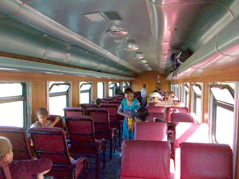 Поезд состоит из тепловоза ТЭ33А-0119 и одного плацкартного вагона в стандартной для Казахстана светло-голубой расцветке, «под государственный флаг». Удаётся фотографировать линию из тамбура, хотя это рабочий тамбур и периодически проводник протестует.