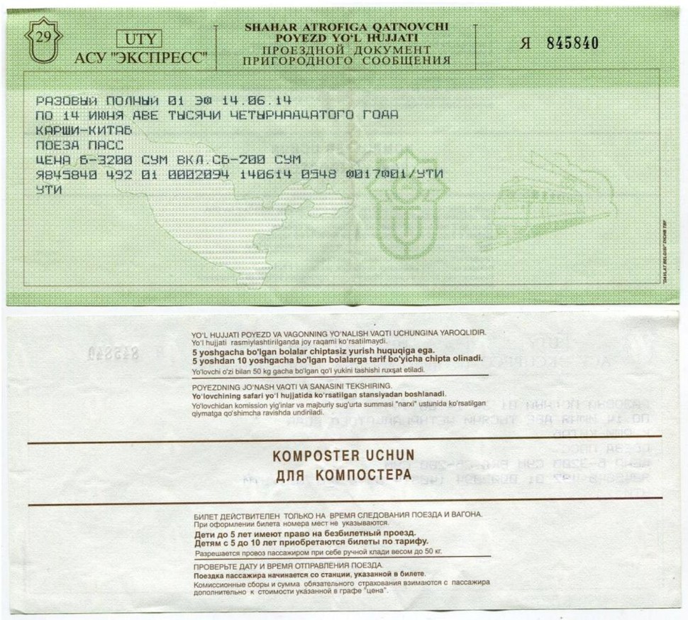 Билет на пригородный поезд выглядит так же, как стандартный билет на поезд дальнего следования. Но в нём упомянуто, что перевозчик — «Каламанындагы Тасымалы» (АО «Пригородные перевозки»).